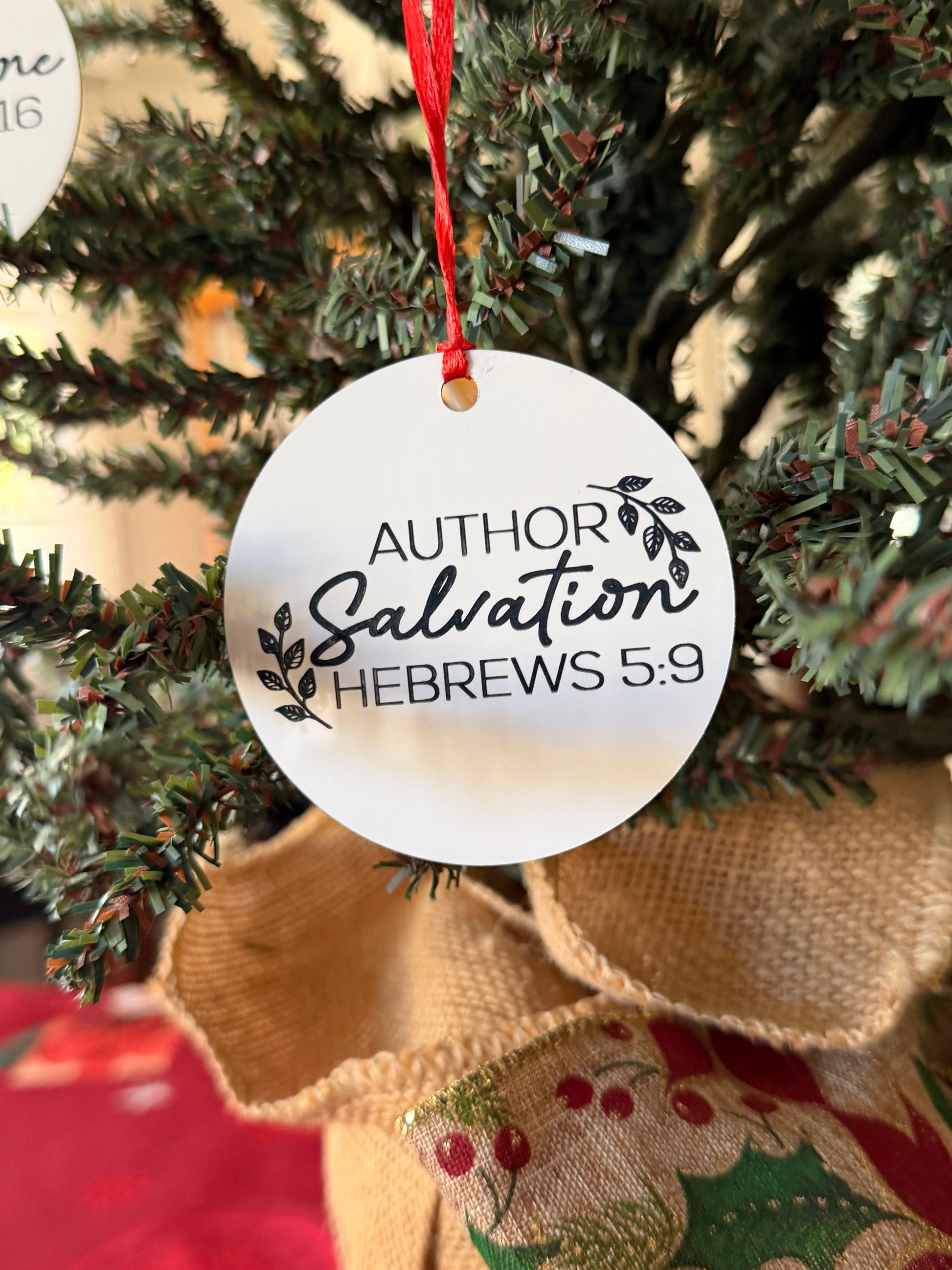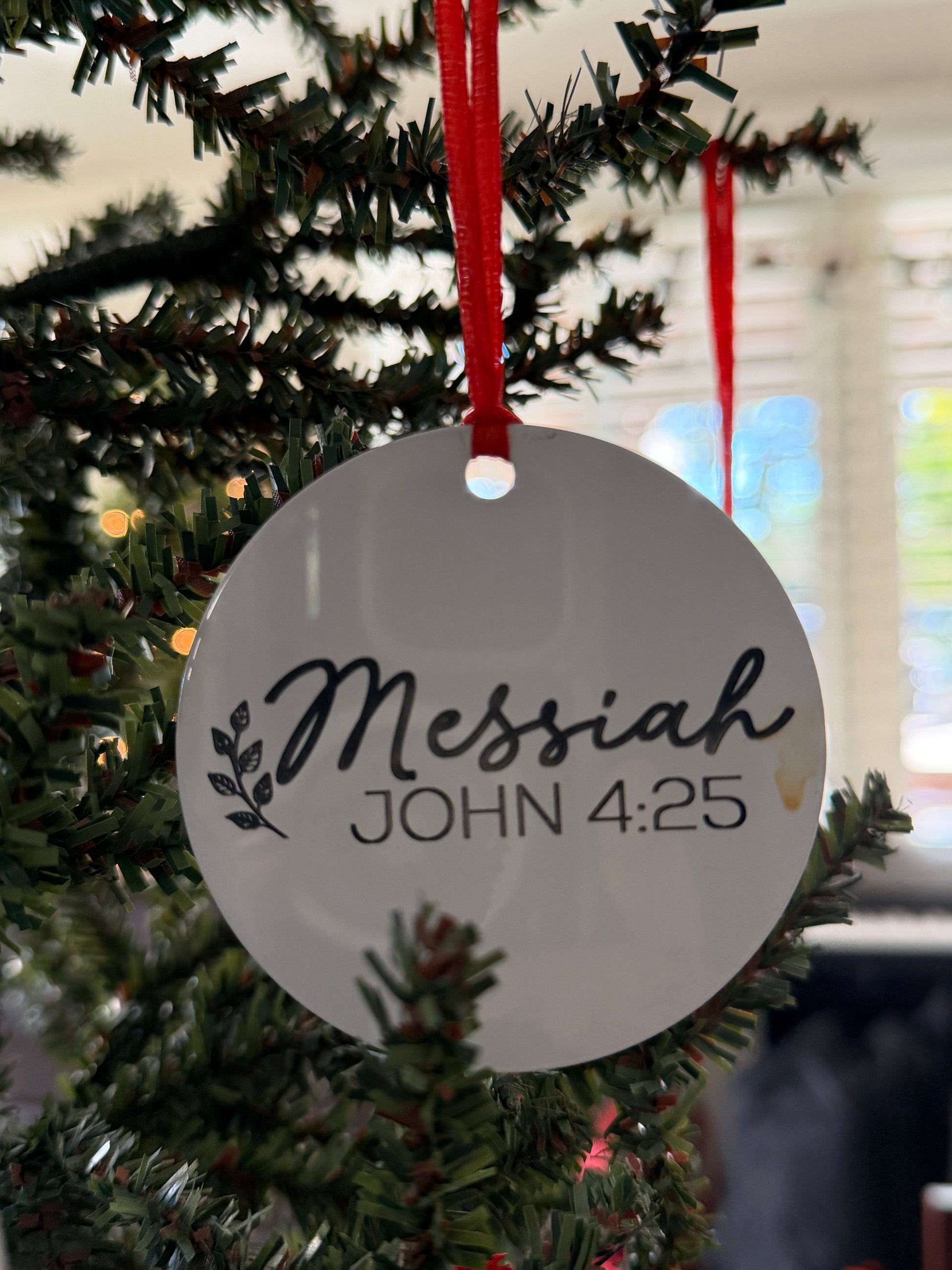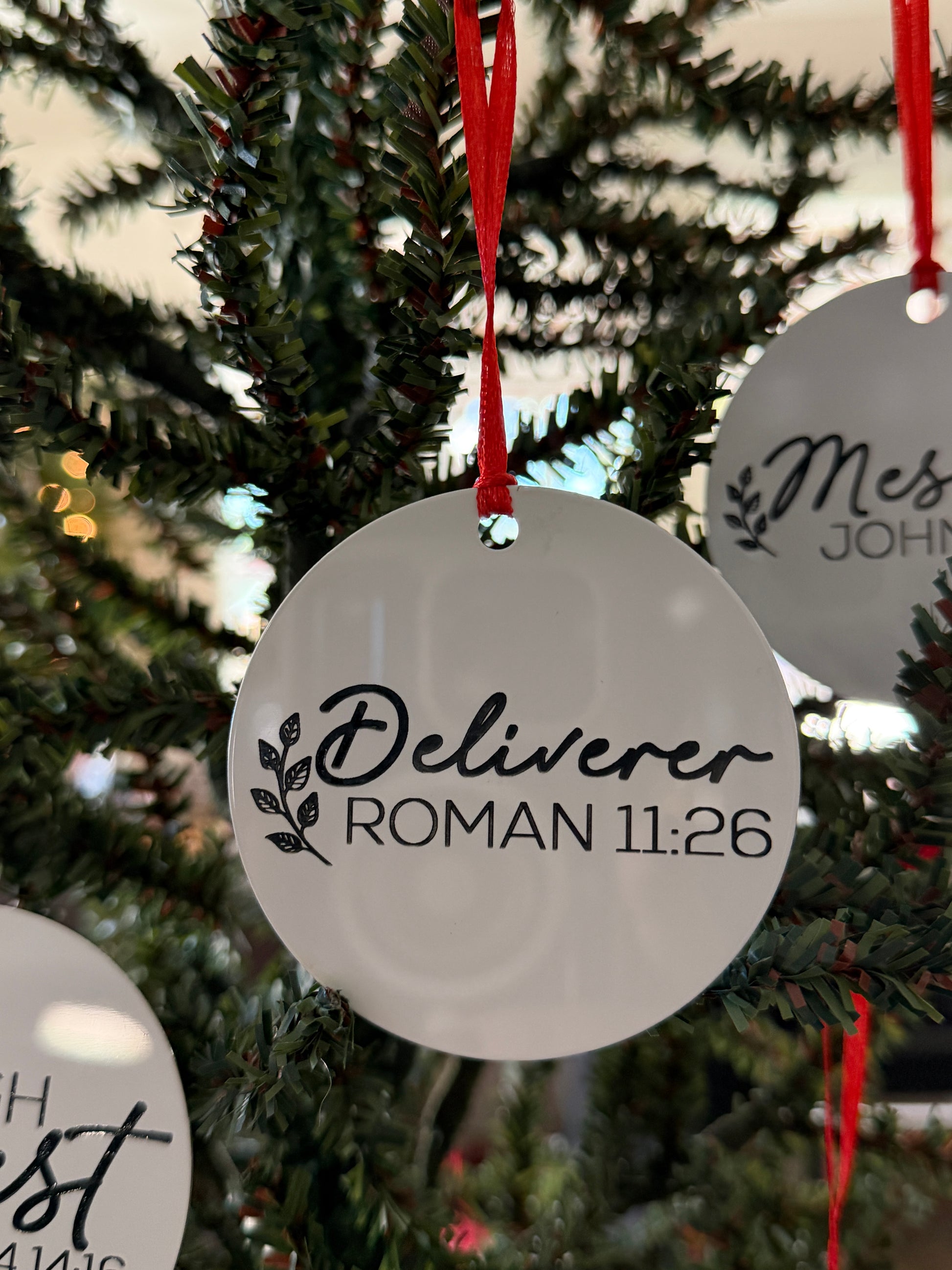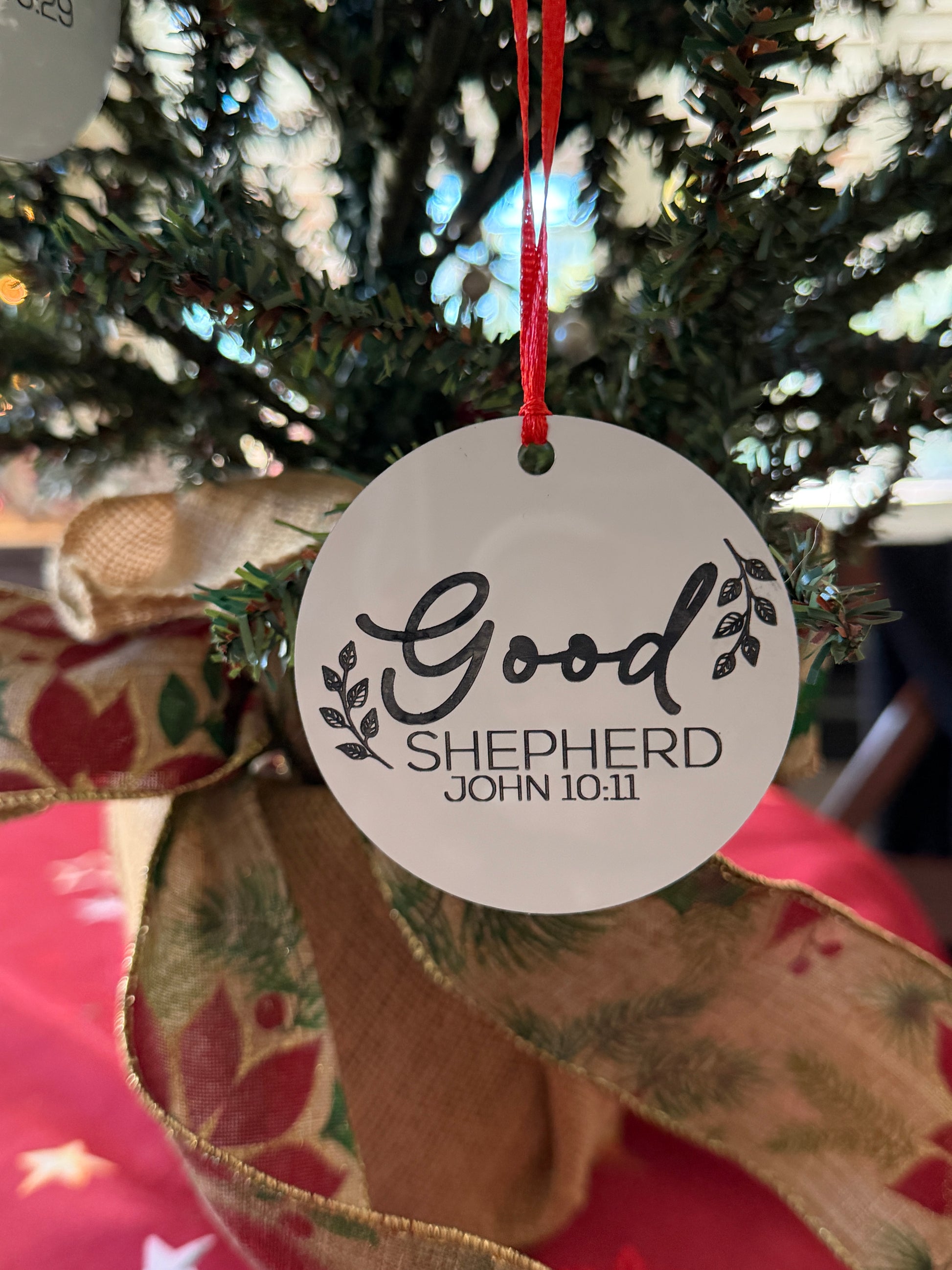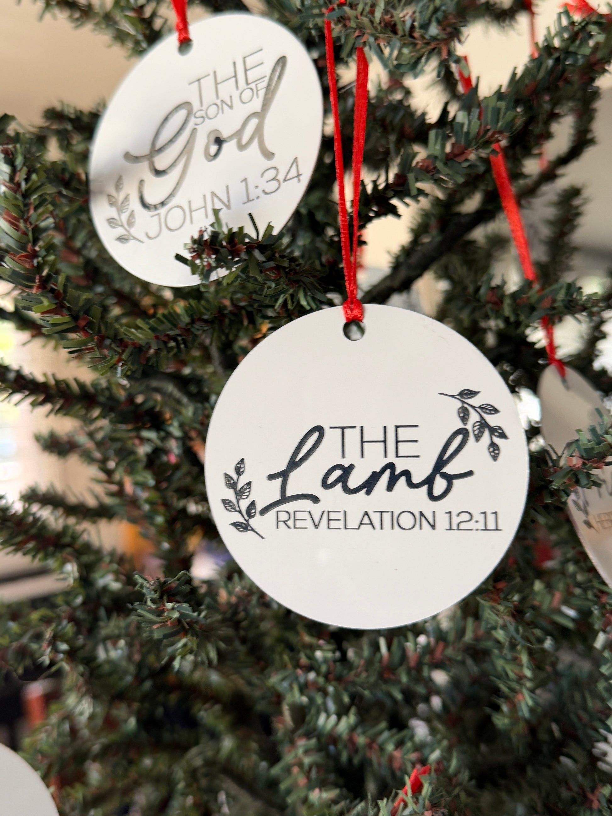These ornaments are crafted from lightweight, durable white aluminum and permanently engraved—no vinyl, no fading, no peeling. Each piece hangs from a red ribbon and is ready to display on your Christmas tree, wreath, garland, or a dedicated Names of Jesus tree.