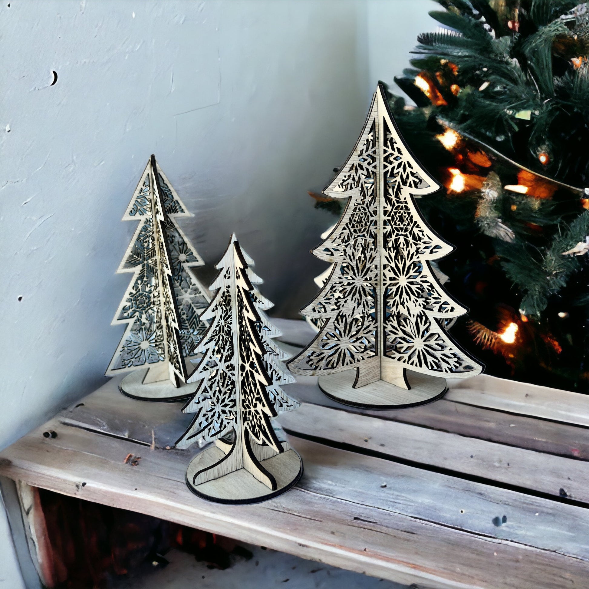 Introducing our exquisite Standing Christmas Trees, a delightful addition to your holiday decor that seamlessly blends natural charm with intricate craftsmanship. Crafted from laser-cut birch wood, these captivating trios stand at three distinct heights, measuring 15cm, 20cm, and 25cm, providing a dynamic visual element for your festive display.