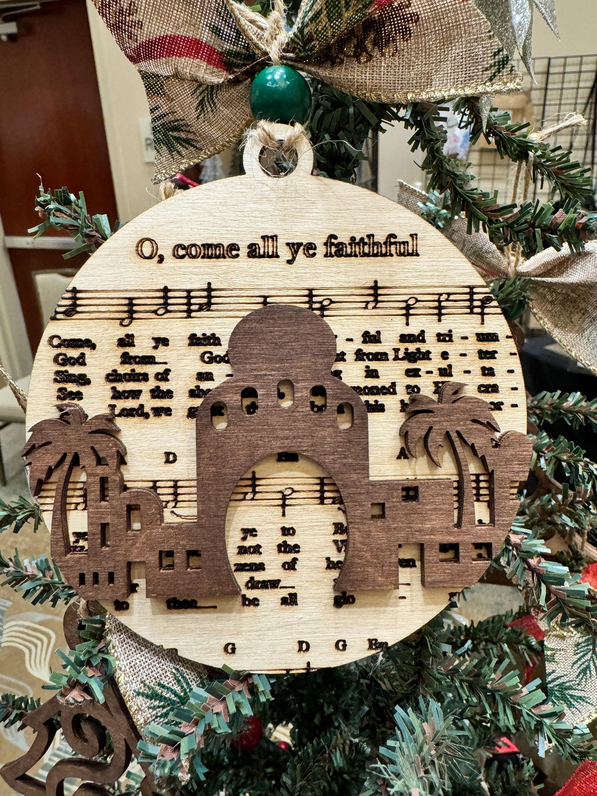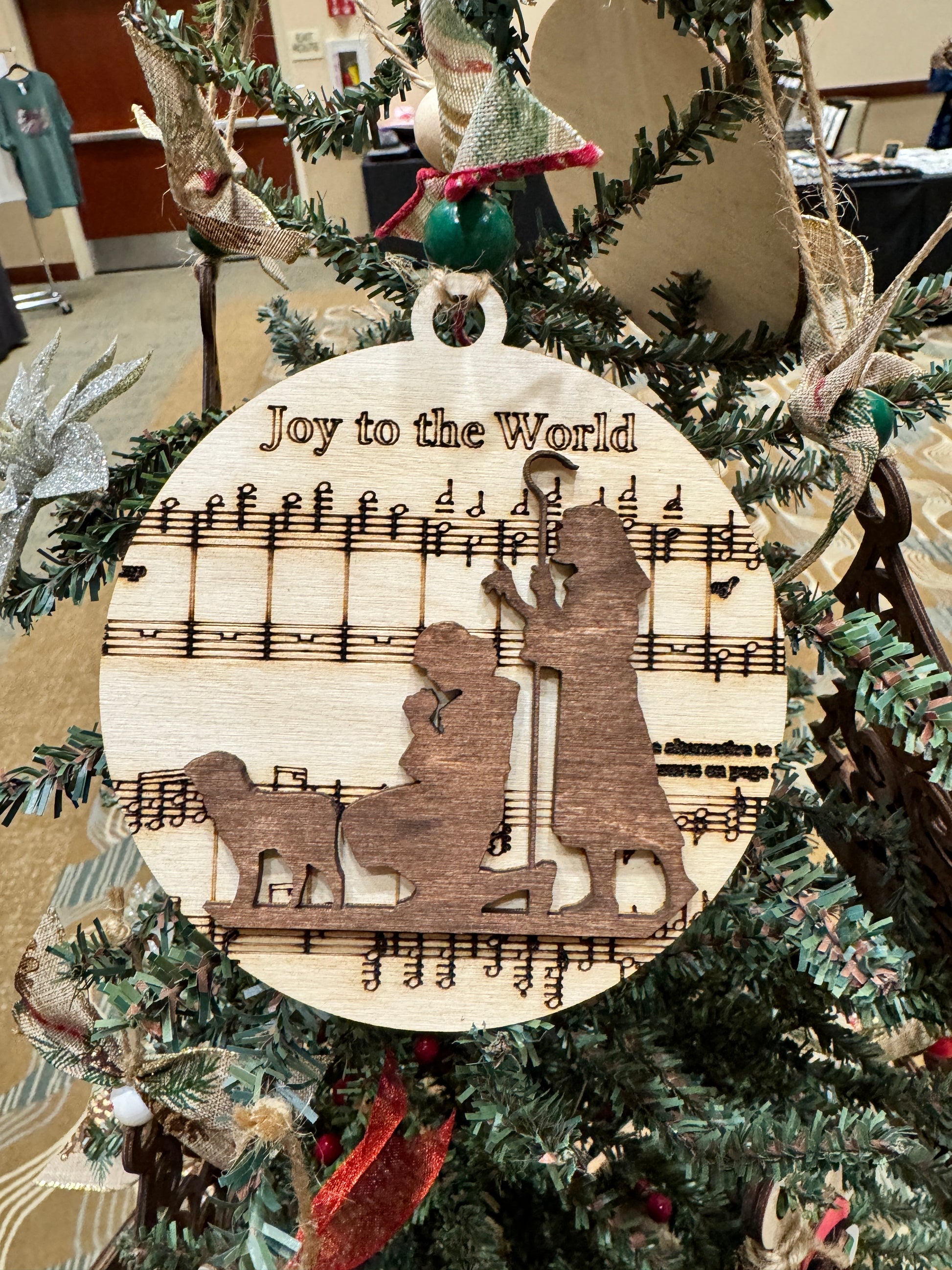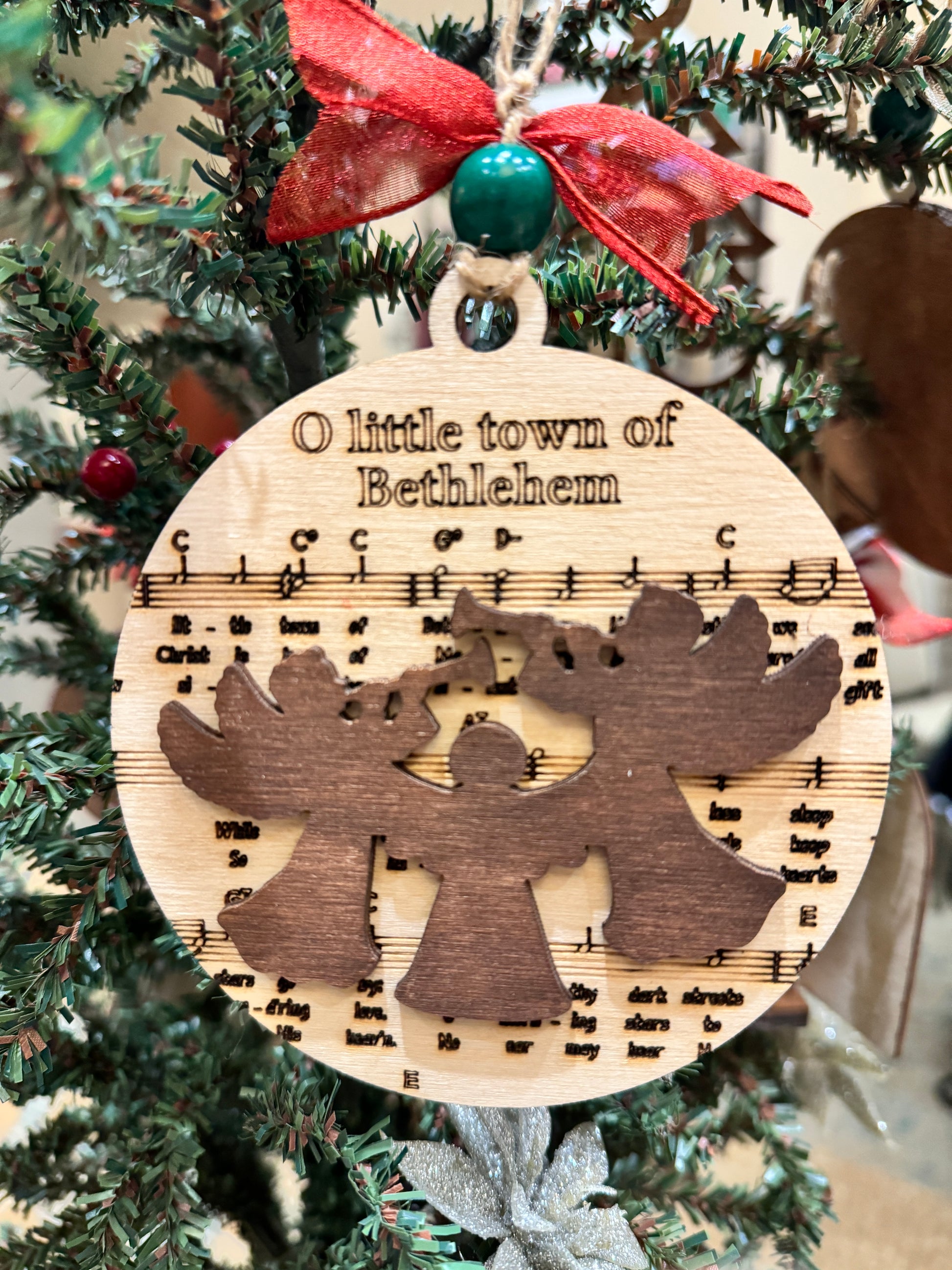 This wooden Christmas music ornament is the perfect addition to any holiday decor. Measuring approximately 3.5", it features two layers with music notes and different parts of the Christmas story. The ornament is finished off with a ribbon and wooden bead for a festive touch. Add a musical and meaningful touch to your holiday decorations with this ornament.