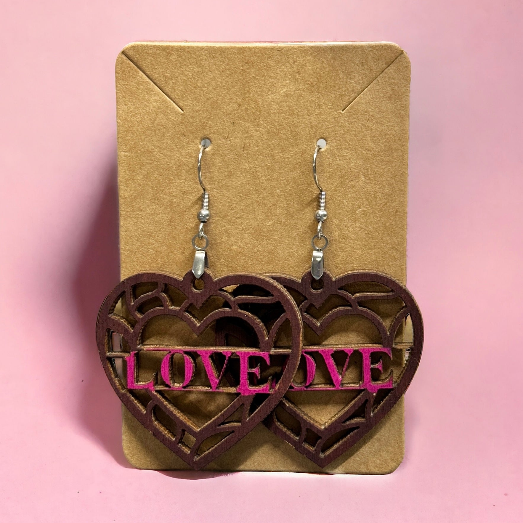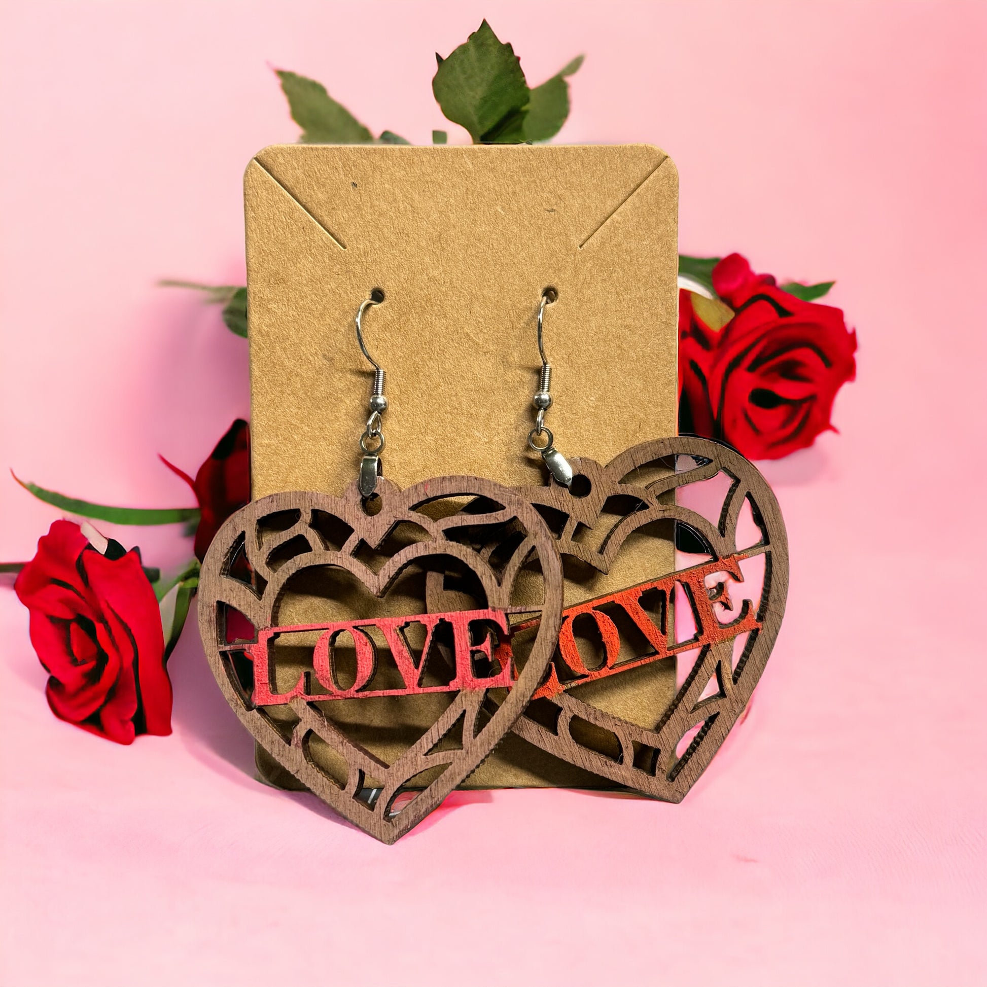 Indulge in the artistry of our Wooden Heart Lace Pattern Earrings. Handcrafted from laser cut birch, these delicate heart-shaped earrings measure approximately 2 inches. With hypoallergenic hooks and a choice of a red or pink center, these earrings are both stylish and gentle on the skin. Elevate your everyday look with these elegant and exclusive earrings.