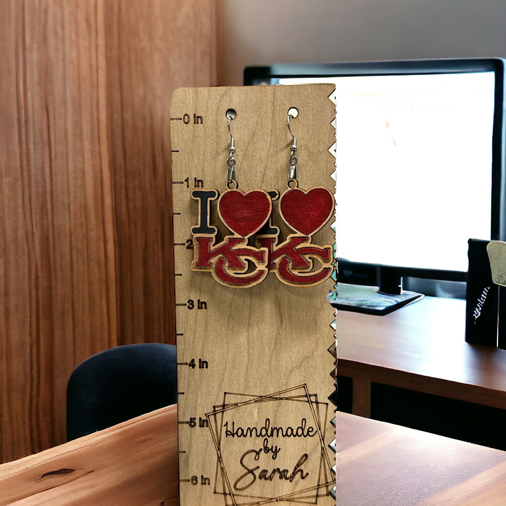 Take your love for the Kansas City Chiefs to the next level with these bold wooden earrings! Made from birch and featuring the phrase "I love KC," these laser cut earrings measure 2.5 inches and are the perfect statement piece. Plus, with hypo-allergenic stainless steel ear wires, you can wear them with confidence to any game or event. Take a risk and show off your love for KC with these daring earrings!