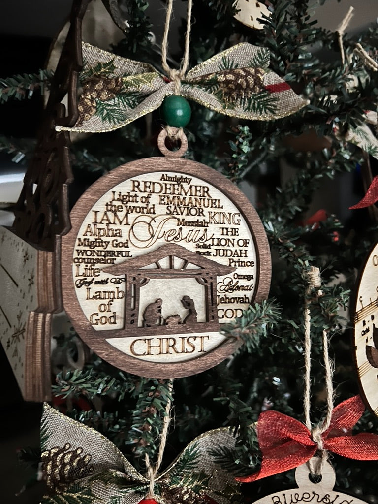 Introducing the Wooden Names of Jesus Ornament. This 2-layer wooden ornament features engraved names of Jesus on one layer, and a Nativity scene on the second. Its size of approximately 3.5" makes it a perfect addition to any Christmas tree. Each ornament is topped off with a ribbon and wooden bead for a charming touch.