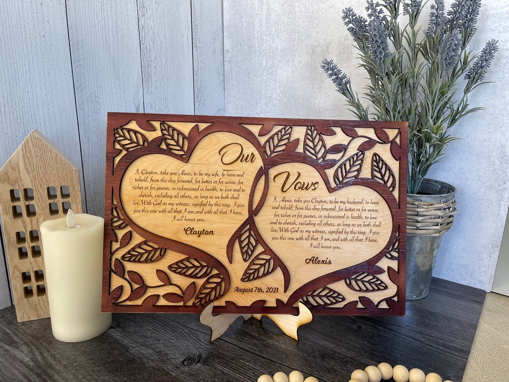 Preserve your wedding vows forever with our Wooden Wedding Vow Sign. Crafted from birch wood and engraved with care, it measures 7.5" x 12" and features a double layer for added durability. A perfect keepsake to display in your home and cherish the memories of your special day.